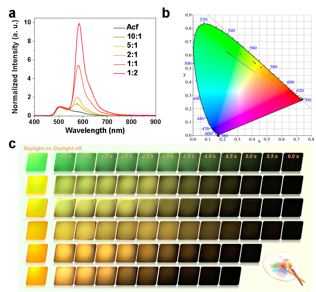 研究者首先通过变温延迟光谱测试验证了薄膜余辉发射的TADF性质。如图2b所示,薄膜在短波长区域的余辉发射峰强度随温度升高而增强,属TADF发射,而长波长区域的余辉发射峰强度则随温度升高而减弱,属RTP发射。室温下,薄膜主要展现出短波长区域的TADF余辉发射。根据相关光物理关系,增大轨道重叠程度,增强分子刚性,可以增大`∆EST,增强0-0吸收带,也会延长荧光余辉寿命。具有一定刚性的罗丹明B和吖啶橙染料对应的薄膜也展现出可见光激发的荧光余辉发射,且吖啶黄薄膜的余辉持续时间最长。研究者还通过固态溶剂效应(图3a-3b)及与商品化产品的对比(图3c)证明了增大∆EST可以延长荧光长余辉发射,其中,商品化吖啶黄制备而得的PVA薄膜荧光余辉持续时间超过10 s,拟合寿命可达0.60 s,反系间窜越速率被降低至100s-1数量级。
