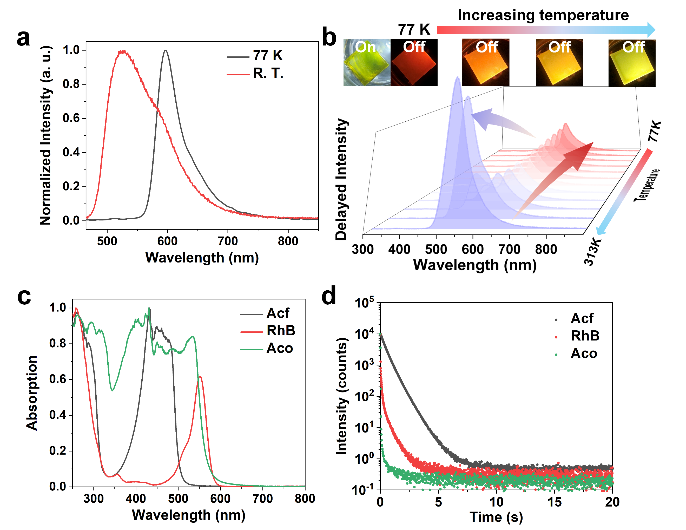图2 (a) 吖啶黄PVA薄膜77 K下及室温下归一化的延迟光谱。(b) 吖啶黄PVA薄膜不同温度下的延迟光谱。(c) 吖啶黄、罗丹明B和吖啶橙的PVA薄膜的紫外-可见吸收光谱。(d) 吖啶黄、罗丹明B和吖啶橙的PVA薄膜的余辉动力学衰减曲线。