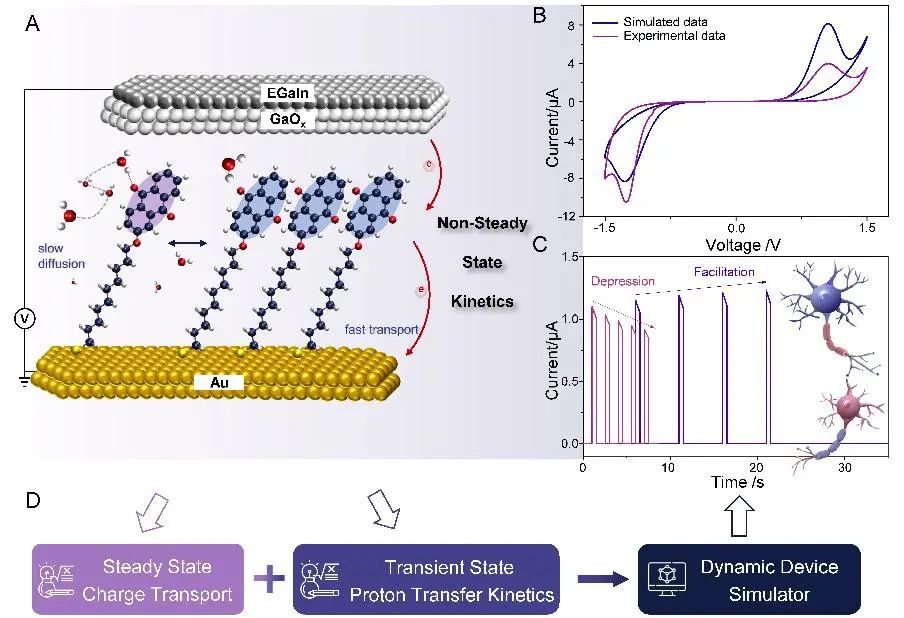 图1 A. 蒽醌分子器件设计概念图. B. 实验和理论模拟电流-电压响应. C. 模拟在连续脉冲刺激下的类突触分子结的动态响应. D. 非稳态输运和动力学器件的定量研究方法。