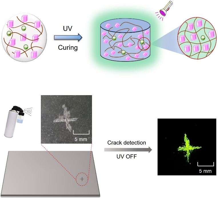 无定形有机长余辉发光材料可以实现简单的溶液加工和大面积均匀发光,但这类材料的发光性能受材料本征刚性环境的影响较大。为此,我们提出了一种紫外光固化增强(UV-curing-enhanced)有机主客体掺杂体系长余辉性能的普适策略,即通过光固化构建的刚性环境促进主客体之间的相互作用,从而诱导出高性能长余辉发射。利用这种可溶液加工、可大面积涂覆和“易于实现”的材料制备策略,有望促进无定形有机长余辉材料在信息标记与保护、表面无损探伤等领域的深度应用。同时,在表面无损探伤领域,对比磁粉检测和渗透检测,这类具有自主知识产权的新型试剂类无损探伤方法的成像更加便捷迅速,且技术附加值更高,有望为有机长余辉材料打开一个重要的商业应用出口。