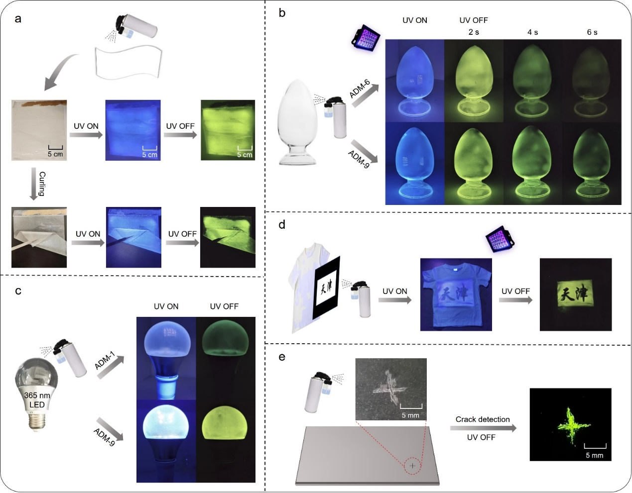 近日,天津大学胡文平/汪天洋团队成功研发出一种多功能有机长余辉喷雾,可实现溶剂化制备并实现大面积喷涂,在信息标记与保护、表面无损探伤领域展现出独特的应用思路。相关成果发表于国际顶级期刊《Advanced Materials》。