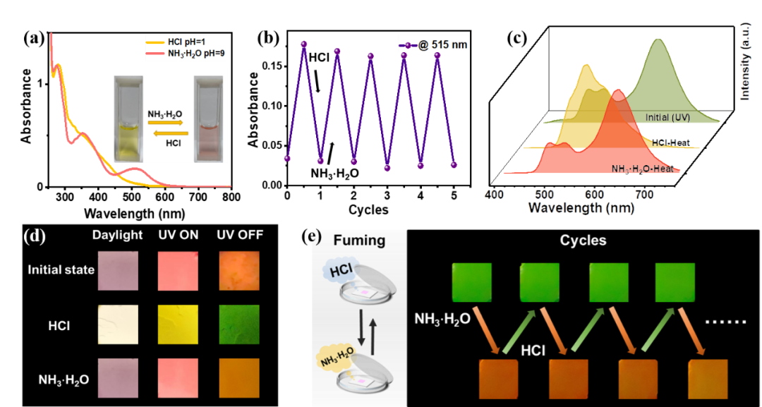 图3 a) pH=1和pH=9时P5水溶液的紫外可见吸收光谱;b) P5水溶液紫外吸收强度的酸碱刺激循环性;c) P5酸碱熏蒸后的磷光发射光谱;d) P5初始状态和酸碱熏蒸后的照片;e) P5酸碱循环熏蒸的余辉照片