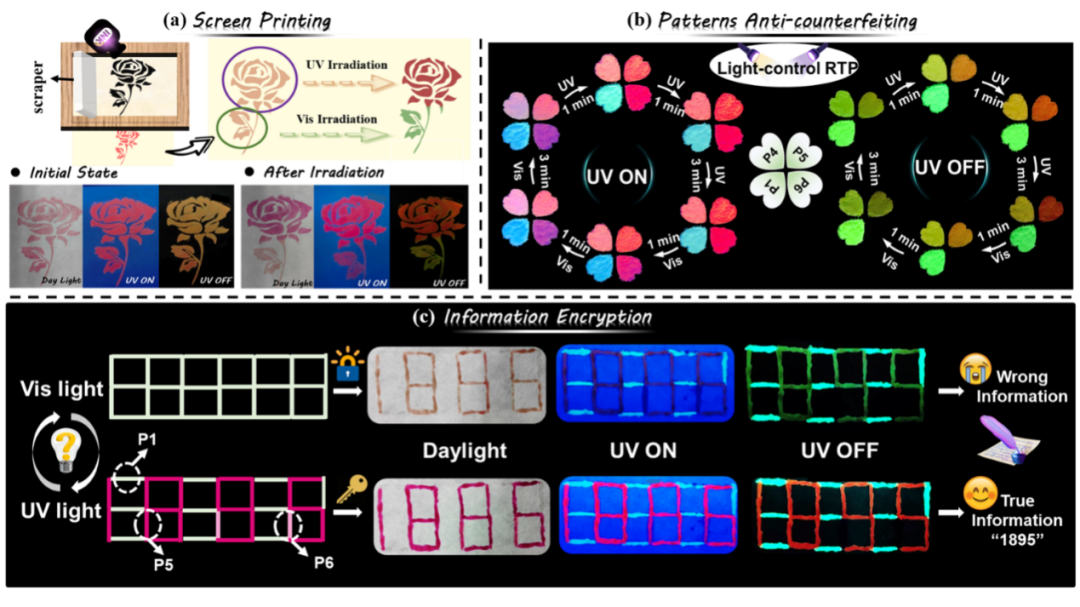 基于多刺激响应聚合物体系余辉颜色可调的特点 , 研究者成功实现了不同的多重防伪平台,可以在油墨、标签及信息存储等方面加以应用。该论文第一作者是天津大学分子聚集态科学研究院博士生杨玉琦,共同通讯作者为杨琨博士、唐本忠院士和李振教授。