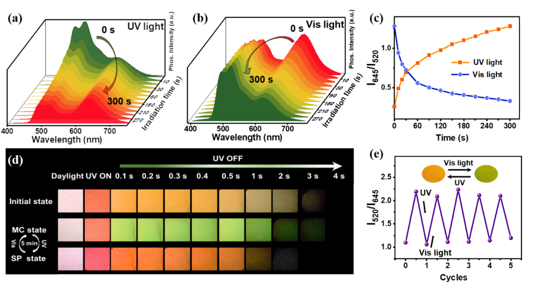 图2 a) 310 nm紫外照射300 s过程中P5的时间依赖性磷光光谱;b) 可见光照射300 s过程中P5的时间依赖性磷光光谱;c) 紫外和可见光照射过程中I645/I520的变化趋势;d) P5初始态、MC态、SP态RTP发射照片;e) 紫外和可见光交替照射过程中I645/I520的可逆变化趋势