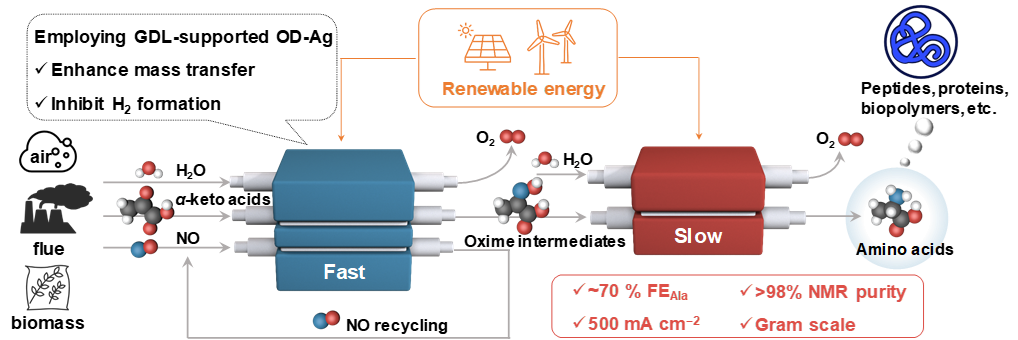 该研究不仅为氨基酸的绿色、高效电合成提供了新思路,还将有助于其他电催化构筑C–N键体系的开发。研究成果以“利用两个解耦的流动反应器由NO和α-酮酸电合成氨基酸(Electrosynthesis of amino acids from NO and α-keto acids using two decoupled flow reactors)”为题,于2023年10月在线发表在《自然•催化》(Nature Catalysis)期刊第10期上(Nat. Catal. 2023, 6(10), 906–915)。
