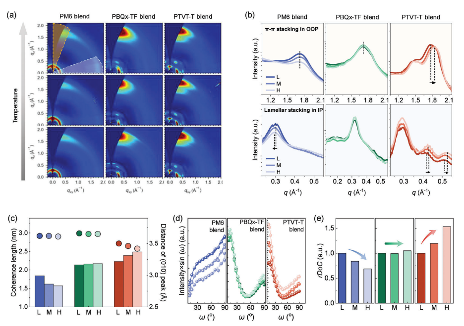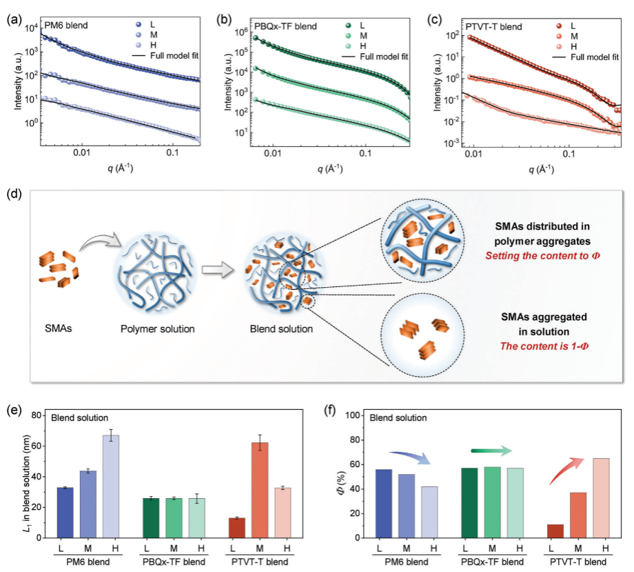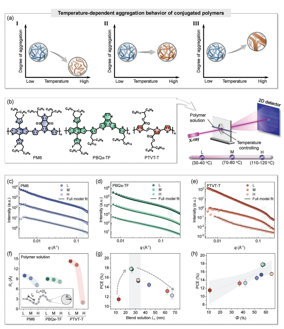 共轭聚合物的溶液聚集结构对有机电子器件的形态及其最终的光电性质至关重要,这在研究领域内引起了极大的关注。精确表征有机光伏(OPV)混合溶液的聚集结构及其温度依赖性变化仍然具有挑战性。天津大学叶龙教授团队利用小角X射线/中子散射技术,系统地研究了三种代表性高效OPV混合溶液的温度依赖性溶液聚集结构。在先进的OPV混合溶液中,阐明了三种溶液加工韧性的情况。高效PBQx-TF混合溶液的卓越加工韧性可以归因于在高温下多尺度溶液聚集结构的最小变化。重要的是,首次在OPV混合溶液中提出了一个新的参数——聚合物聚集体中受体分布的百分比(Ф),并建立了Ф与性能之间的直接相关性。器件性能与与小尺度聚合物聚集体相关的柱状结构的库恩长度L1以及大尺度下的Ф密切相关。在L1约为30纳米且Ф在60±5%范围内时,器件性能达到最优。这项研究代表了有机电子聚集结构研究的重要进展。