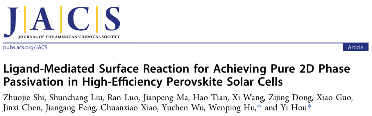 Zhuojie Shi, Shunchang Liu, Ran Luo, Jianpeng Ma, Hao Tian, Xi Wang, Zijing Dong, Xiao Guo, Jinxi Chen, Jiangang Feng, Chuanxiao Xiao, Yuchen Wu, Wenping Hu*, and Yi Hou*. Ligand-Mediated Surface Reaction for Achieving Pure 2D Phase Passivation in High-Efficiency Perovskite Solar Cells. J. Am. Chem. Soc. 2025, 147, 1055−1062.