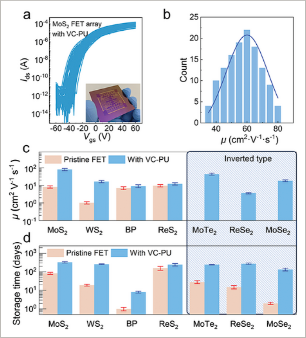为了进一步验证该策略在实际应用中的可行性,科研团队利用晶圆级MoS2薄膜制备了包含 64 个晶体管的大面积器件阵列。经过 VC - PU 处理后,两个阵列中所有晶体管的 128 条转移曲线均表现出良好的特性,迁移率、亚阈值摆幅和Ion/Ioff值均得到提升且波动在可接受范围内,所有处理后的晶体管迁移率近似呈正态分布,约为57.5±2.5 cm2·V-1·s-1,这充分表明该稳定化策略在二维材料的大面积应用中切实可行。此外,该策略还具有广泛的适用性,对包括MoS2、WS2、磷烯、ReS2、MoTe2、ReSe2和MoSe2等多种二维材料均有效,且经过 VC - PU 处理后,部分原本仅具有单极 p 型传输行为的二维材料在空气中展现出了良好的 n 型场效应性能和高电子迁移率,体现了 VC 对二维材料的极性反转能力,进一步拓展了二维材料在电子器件领域的应用潜力。