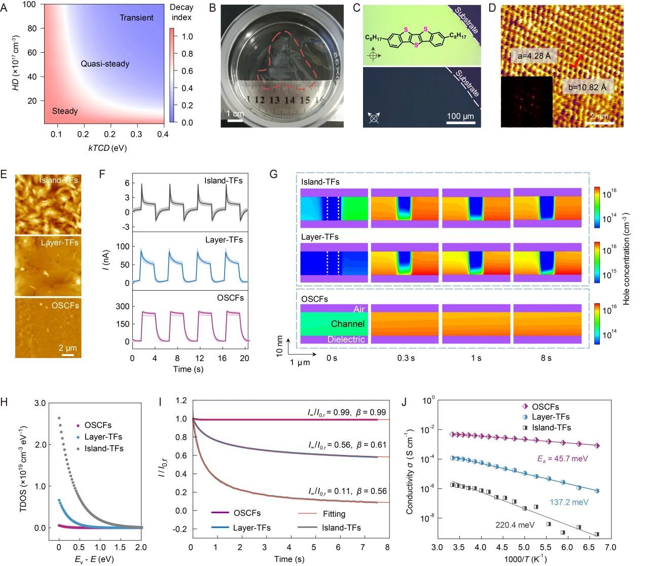 调整半导体通道的结晶性,实现了器件可编程的时间依赖响应。高结晶性薄膜减少载流子陷阱态,使EST产生更稳定的信号输出。通过TCAD模拟与实验结合,建立了感应电荷传输的动力学模型,为优化性能提供理论支持。