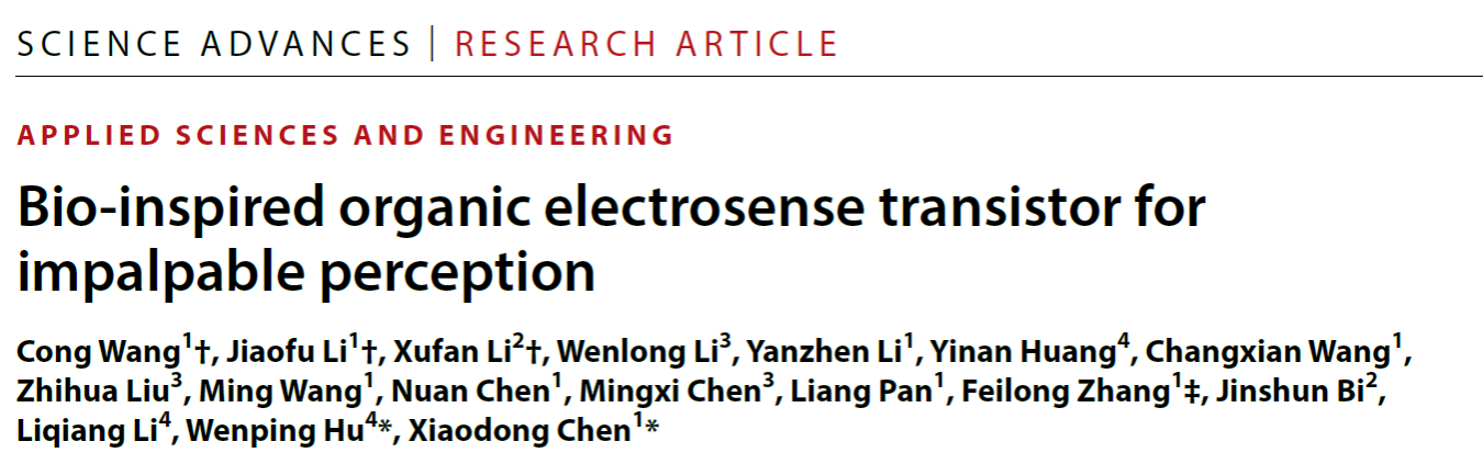 人工感知技术在模仿人类视觉和触觉方面取得了备受瞩目的进展,但仅限于具有光照和可触摸条件。一些动物如板鳃类鱼通过“第六感”感知电场,从而能够在低能见度条件下导航和捕猎。这启发了电感应器件的开发以应对无形感知缺口。近期,新加坡南洋理工大学研究人员与合作者开发了一种有机电感知晶体管并建立了器件感知动力学模型。该器件能够灵敏并稳定地感知双极静电场,助力开发无形感知系统,推动电感知技术在机器人导航、监控和搜救等领域的应用。该工作发表在Science Advances上。