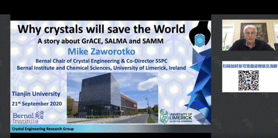 9月21日,受 SmartMat编委会、天津市分子光电科学重点实验室、科研云、能源学人邀请,爱尔兰利默里克大学Michael Zaworotko教授通过bilibili(哔哩哔哩),百度,YouTube等直播平台同步直播了题目为“Why crystals will save the world – A story of GrACE, SALMA and SAM”的学术报告。Prof. Zaworotko介绍了晶体工程在过去30年是如何从最初的设计(形式)发展到目前的性能(功能)。同时介绍了制备两类晶体材料的成功策略,即,多组分药物材料(MPMS)和先进多孔材料。本次讲座得到了广泛关注,bilibili,百度直播,YouTube等平台累积观看人数超过10.2万,观众反响热烈。