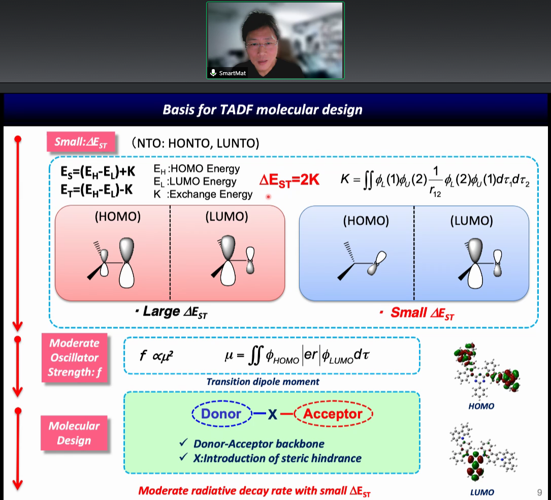 Chihaya Adachi教授为日本九州大学有机光电研究中心(OPERA)主任,1991年博士毕业于九州大学材料科学与技术专业,在回九州大学任教前,他曾先后在日本信州大学、美国普林斯顿大学和日本千岁科学技术大学任职。在报告中,Chihaya Adachi教授向我们介绍了有机发光二极管(OLEDs)的发展历程、结构特征、未来显示应用前景等。其中,由于热激活延迟荧光(TADF)材料分子设计具有无限的可能性,基于TADF不仅构筑了高性能的发光二极管,且丰富了有机光化学领域的研究。具体来说,传统的OLED发光材料根据发光原理的不同分为荧光材料和磷光材料,即第一代和第二代发光材料。荧光材料的内部最大量子效率为25%,而磷光材料最大为100%。2012年Chihaya Adachi教授课题组通过将TADF材料做辅助掺杂剂制备了有机器件,使其内部量子效率达到了100%,由于这突出的效率,人们也称TADF材料为第三代有机EL荧光材料。