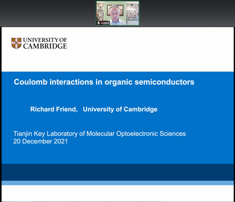 2021年12月20日,受天津市分子光电科学重点实验室胡文平教授邀请,日本九州大学Chihaya Adachi教授、英国剑桥大学Richard Friend教授通过bilibili(哔哩哔哩)、百度、YouTube等分别直播了题为“Coulomb interactions in organic semiconductors”和“Recent progress on hyper-fluorescence OLEDs”的学术报告。