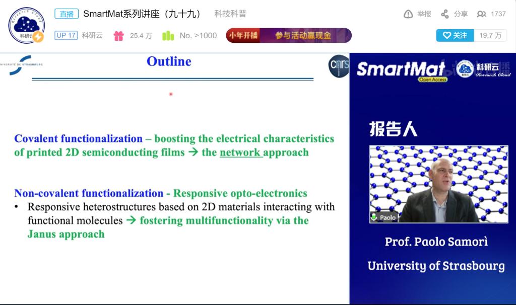 Samorì教授首先介绍了石墨烯材料及其他二维材料的应用前景,随后分别从物理吸附及化学吸附的角度详细介绍了课题组关于二维材料制备及功能实现的新进展。报告后,Samorì教授与多位国内参会高校教师做了深入的交流与探讨,并表示欢迎优秀学子到课题组进行交流学习。此次线上公开讲座吸引了科研云-B站、科研云-斗鱼、科研云-视频号、科研云-百度、科研云-YouTube、科研云-Facebook、科研云官网等直播平台相关领域专业观众累计3.6万+人在线参与观看。