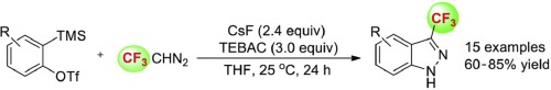 [10] Zhen Chen, Shuang-Qing Fan, Yan Zheng , Jun-An Ma*. Silver-catalyzed regioselective [3+2] cycloaddition of arene-diazonium salts with 2,2,2-trifluorodiazoethane (CF3CHN2): a facile access to 2-aryl-5-trifluoromethyltetrazoles[J]. Chemical Communications, 2015, 51(92): 16545-16548. DOI: 10.1039/c5cc07324c