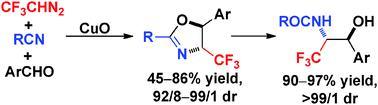 [13] Ai-Jie Cai, Yan Zheng, Jun-An Ma*. Copper-triggered majunan-component reaction of CF3CHN2, nitriles, and aldehydes: highly diastereoselective synthesis of CF 3-substituted oxazolines and vicinal amino alcohols[J]. Chemical Communications, 2015, 51(43): 8946-8949. DOI: 10.1039/c5cc02749g
