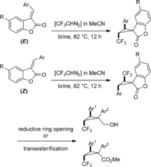 [8] Chuan-Le Zhu, Jun-An Ma*, Dominique Cahard*. Trifluorodiazoethane (CF3CHN2) in the Uncatalyzed Cyclopropanation of 3‐Arylmethylenebenzofuran‐2(3H)‐ones[J]. Asian Journal of Organic Chemistry, 2016, 5(1): 66-69.DOI: 10.1002/ajoc.201500409